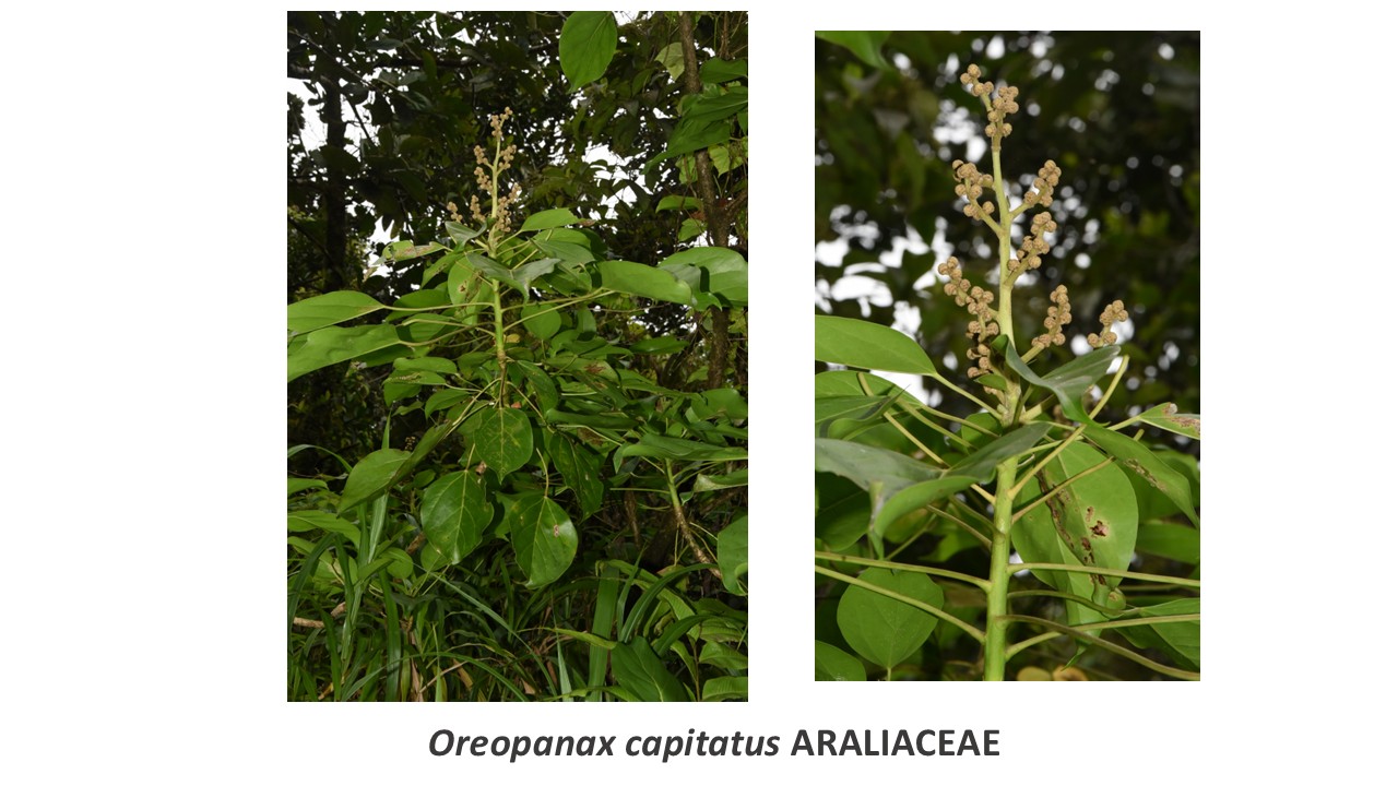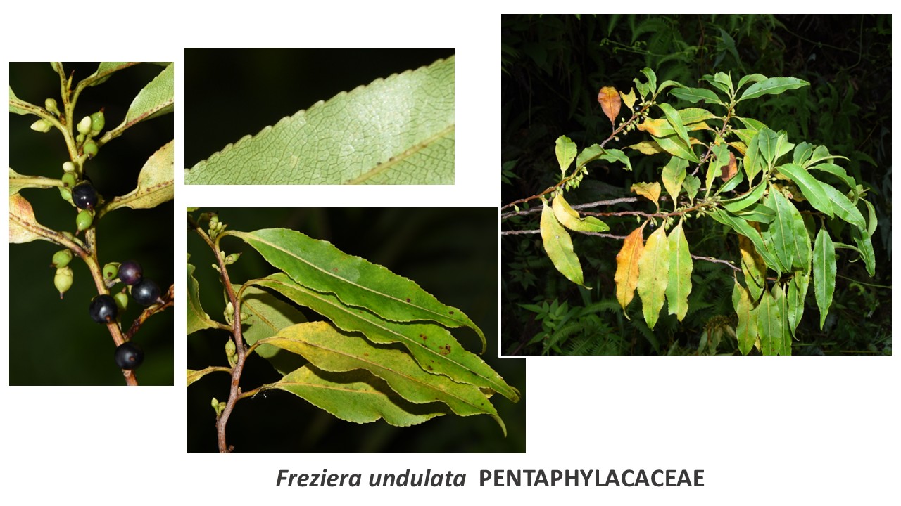 Feuilles non crénelées. 3 nervures principales, roses + 2 marginales. Apex brusquement rétréci avec acumen. Jeunes feuilles fines et allongées. Inflorescences grosses et denses, à fleurs blanches, les infrutescneces pendentes, à petits fruits roses puis noirâtres à maturité.
