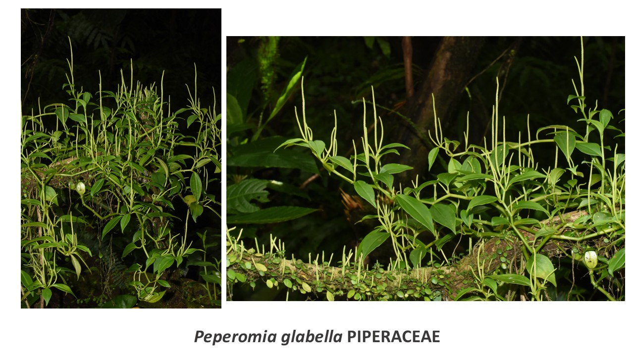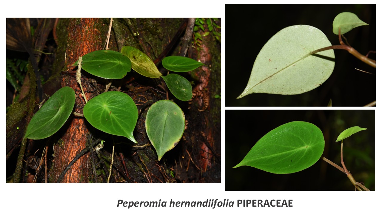 Epiphyte lianescente. Feuilles toutes plates.(Confusion possible avec les autres Peperomia lianescents : Peperomia rotundifolia qui a des feuilles plus épaisses, juteuses, sent l’anis, et Peperomia trifolia qui possède des feuilles verticillées par 3.
