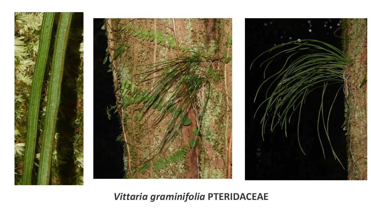 Confusions possibles avec Vittaria lineata mais frondes longues et pendantes, plutôt mésophile.
